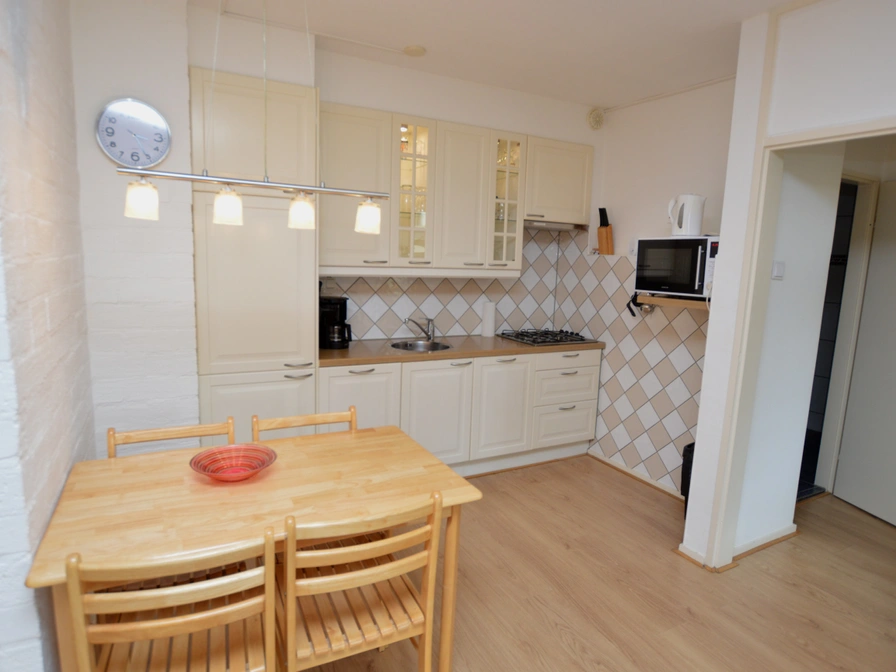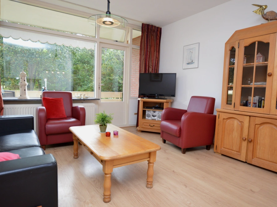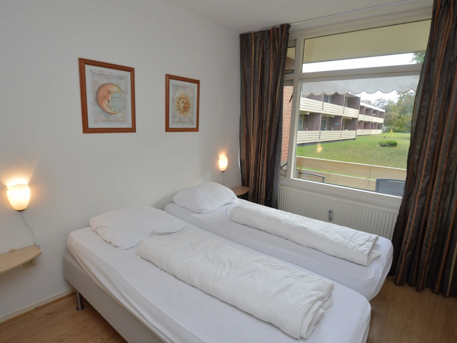 Dit comfortabele appartement ligt op de begane grond aan de tuinzijde van het appartementengebouw. De woonkamer heeft een zithoek met tv en radio/cd-speler en een eethoek. De open keuken is ingericht met een koelkast, 4-pits gaskookplaat , koffiezetapparaat en magnetron. In de slaapkamer staan 2 eenpersoons bedden. De badkamer heeft douche, wastafel en toilet. Dit appartement heeft een afgesloten terras. Tuinmeubilair is aanwezig.