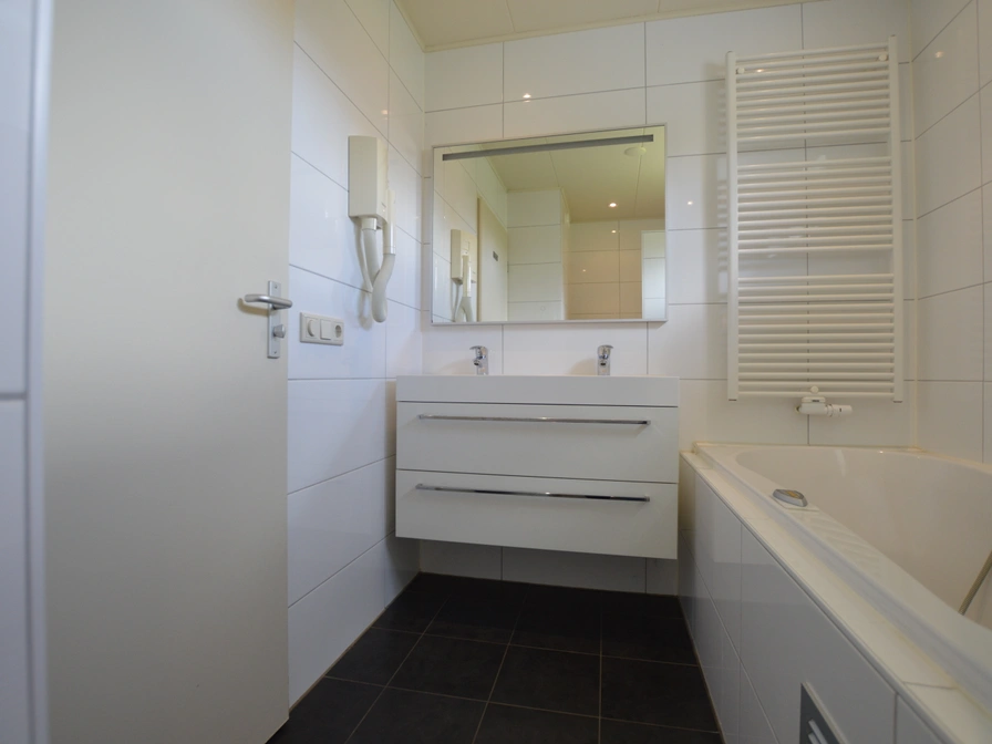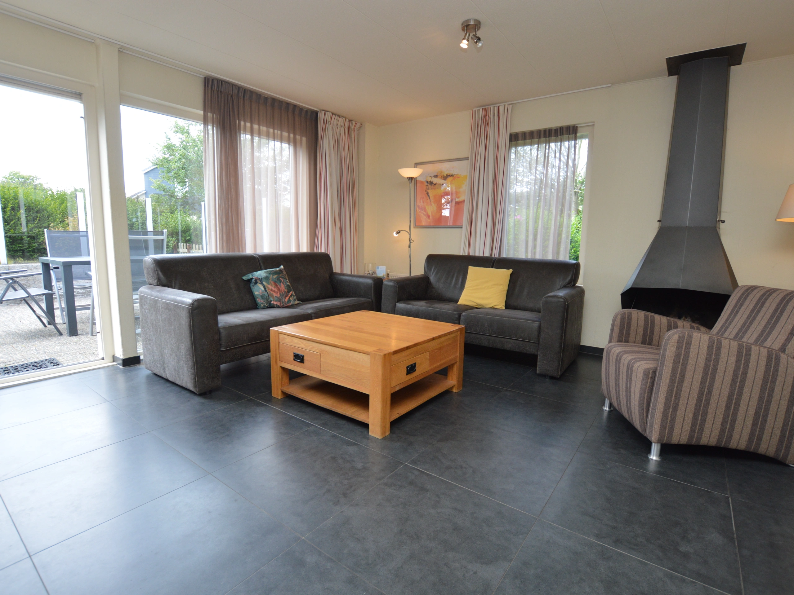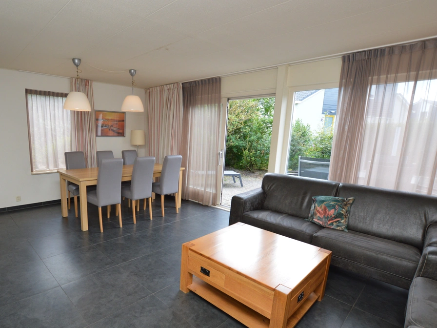 Entree, woonkamer met zithoek, eethoek, tv, radio/cd, dvd speler en open haard. De compleet ingerichte keuken heeft o.a. combi magnetron, koffiezetapparaat (filter), Senseo, afwasmachine en waterkoker. In de bijkeuken vind je een wasmachine en een droger. Het huis heeft 3 slaapkamers waarvan een op de begane grond en twee boven. Alle slaapkamers hebben 2 eenpersoons boxspring bedden en 2 eenpersoons dekbedden. In de slaapkamer beneden en op een van de slaapkamers boven is een extra televisie. De badkamer beneden heeft een ligbad met handdouche, aparte douche en wastafel. Het toilet beneden is separaat. Boven bevindt zich een tweede badkamer met douche, toilet en wastafel. Het huis heeft een tuin (deels afgesloten), terras met tuinmeubels en eigen parkeergelegenheid.
