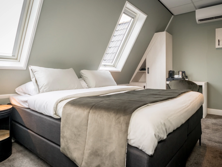 De sfeervolle kleine Basic kamers (16 m2) beschikken over een badkamer met vloerverwarming en een heerlijke regendouche. De kamer beschikt verder over airconditioning, comfortabele boxspringbedden (160/200) met luxe topper, Nespresso koffieapparaat, theefaciliteiten, gevulde minibar (tegen betaling), laptopkluisje, föhn, scheerspiegel, telefoon en een flatscreen televisie met chromecast. De kamer is gelegen op de derde verdieping (lift aanwezig), heeft schuine wanden en geen balkon.