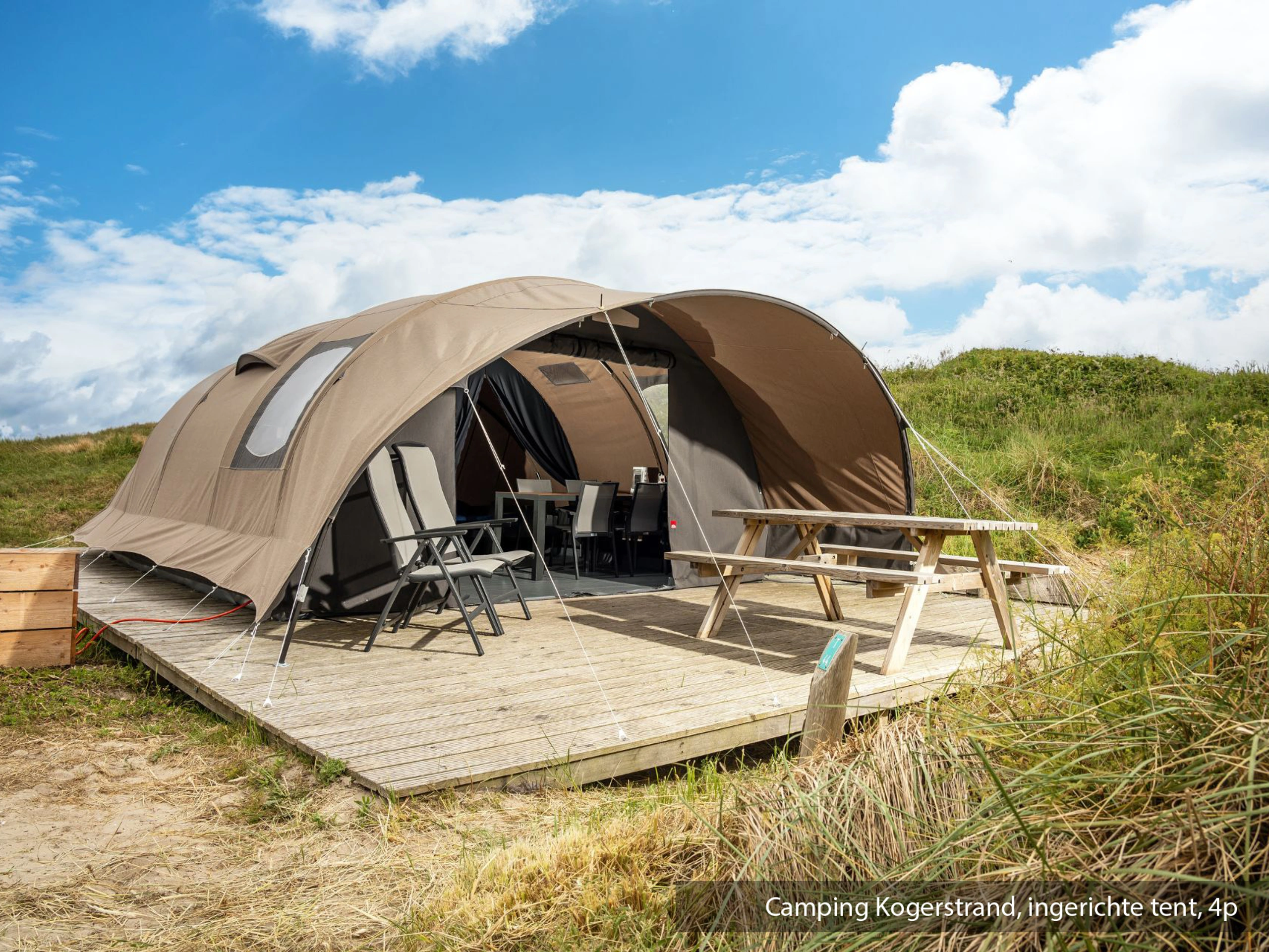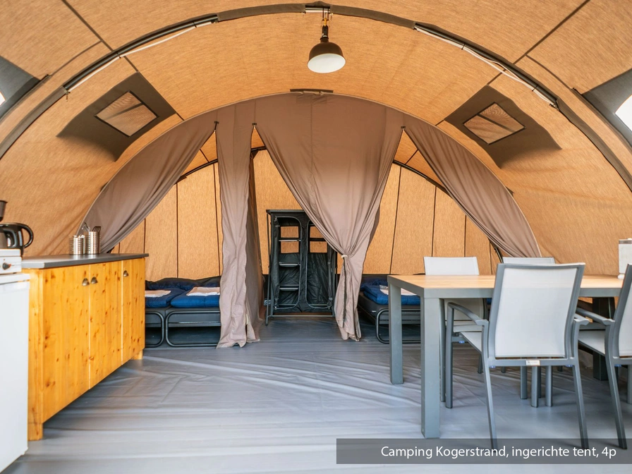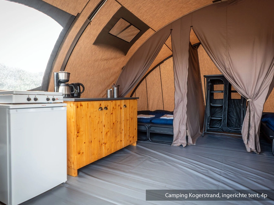 Deze compleet ingerichte tent ligt op een mooi plekje op camping Kogerstrand. De leefruimte is voorzien van een eethoek. De open keuken is ingericht met koelkast, koffiezetapparaat en waterkoker. Er zijn drie slaapcabines met in totaal vier eenpersoonsbedden.