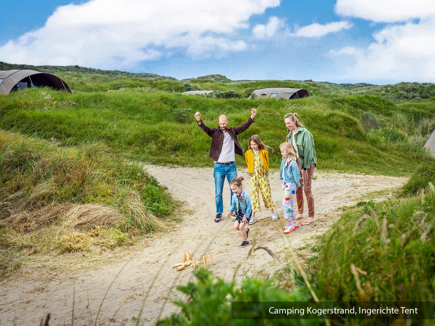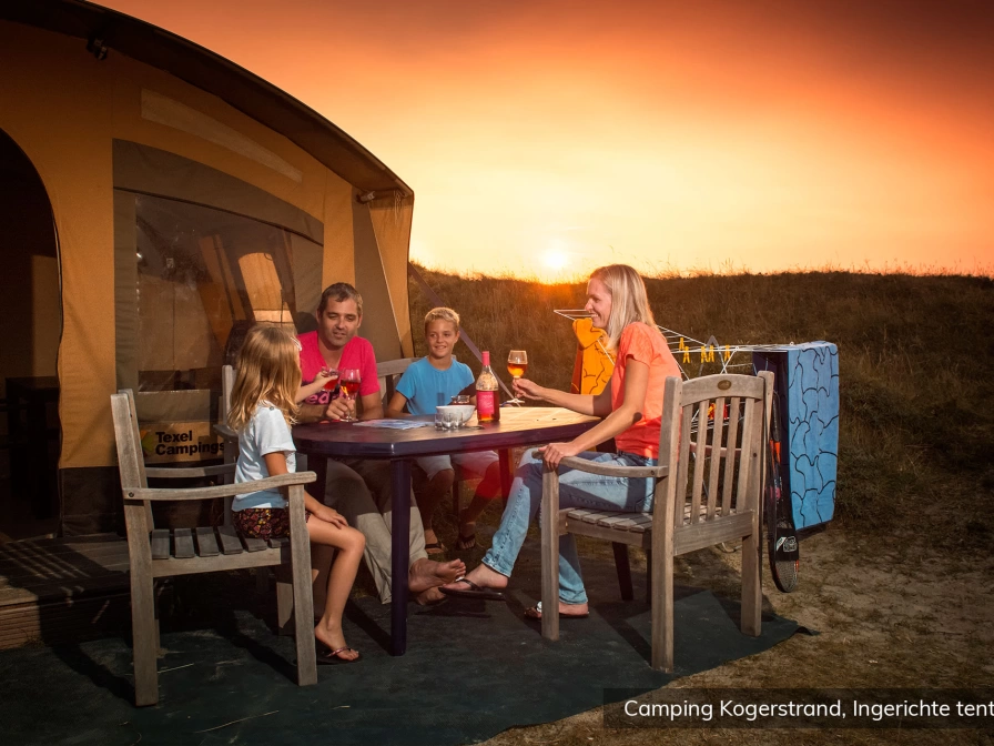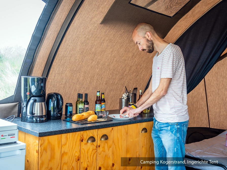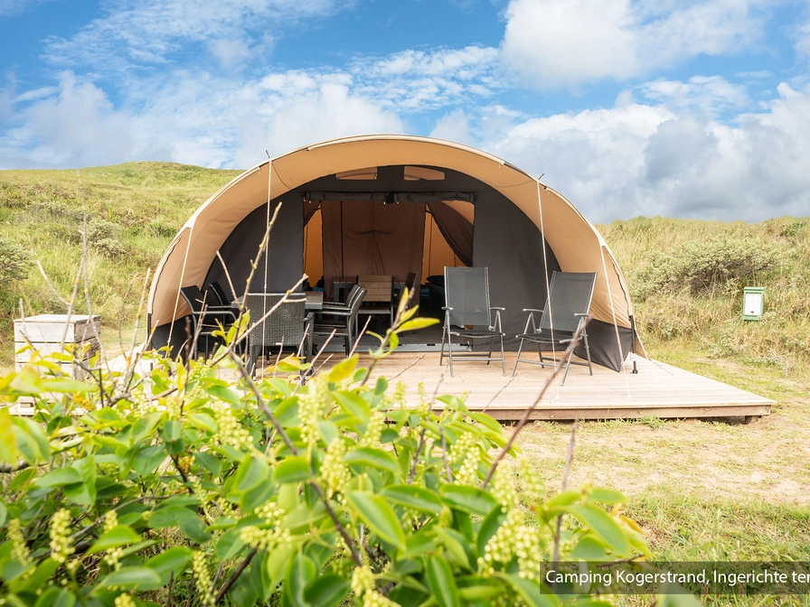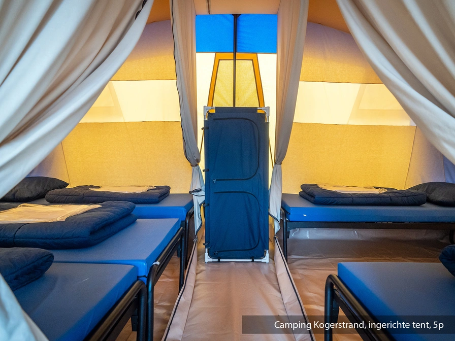 Deze compleet ingerichte tent ligt op een mooi plekje op camping Kogerstrand. De leefruimte is voorzien van een eethoek. De open keuken is ingericht met koelkast, koffiezetapparaat en waterkoker. Er zijn twee slaapcabines met in totaal vijf eenpersoonsbedden.