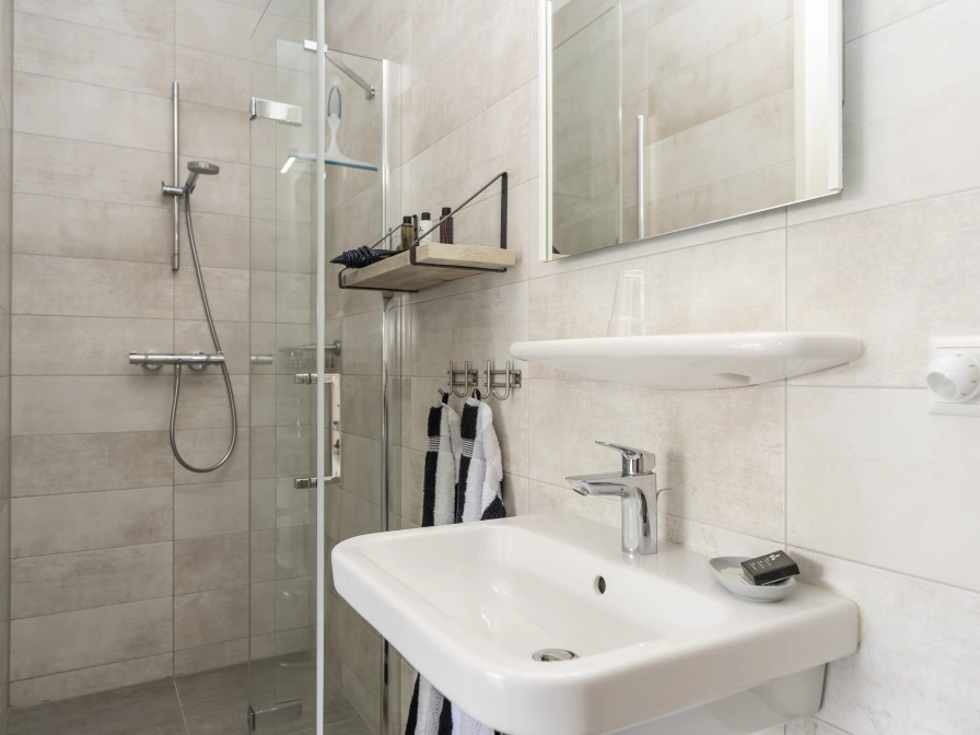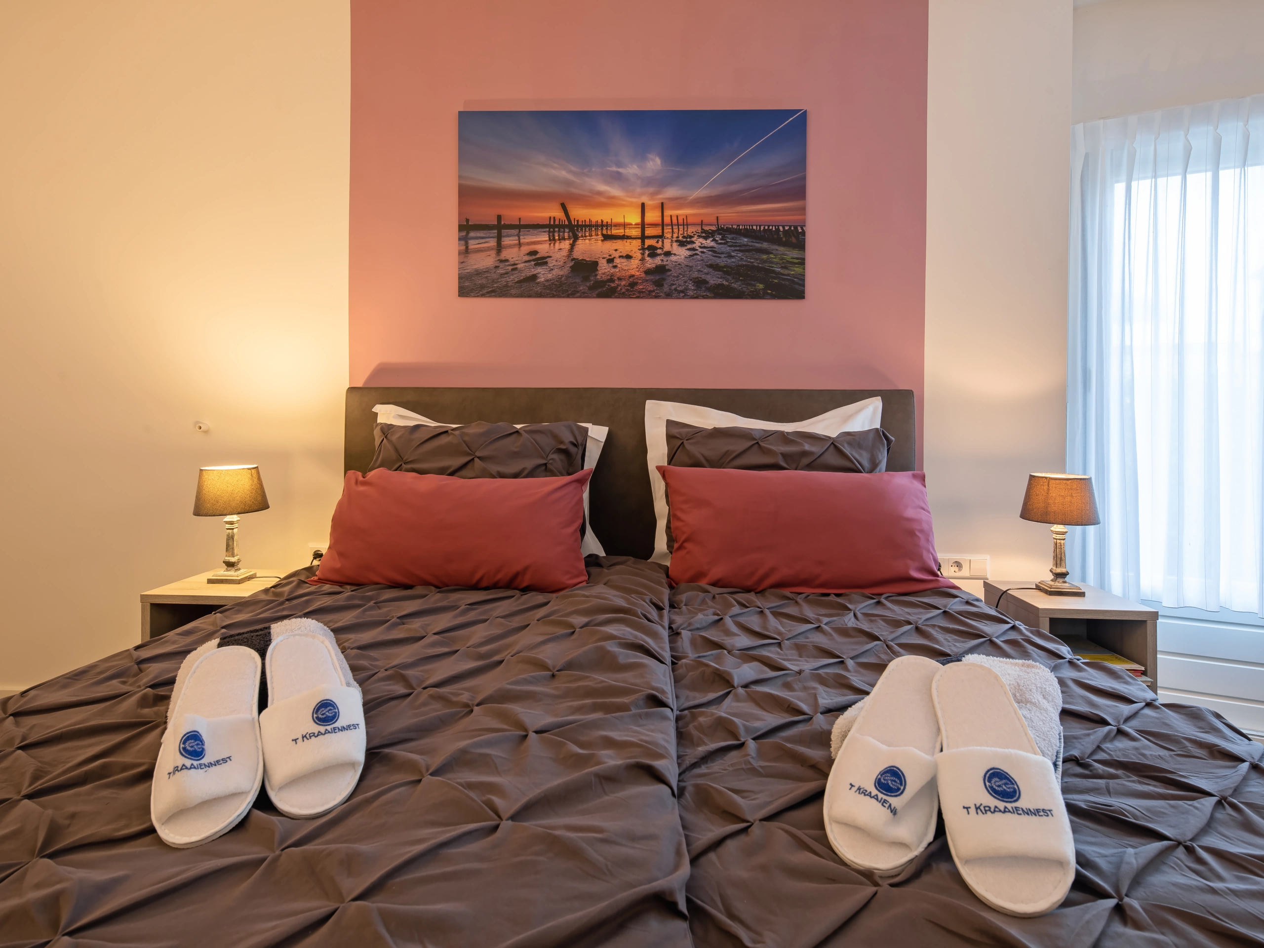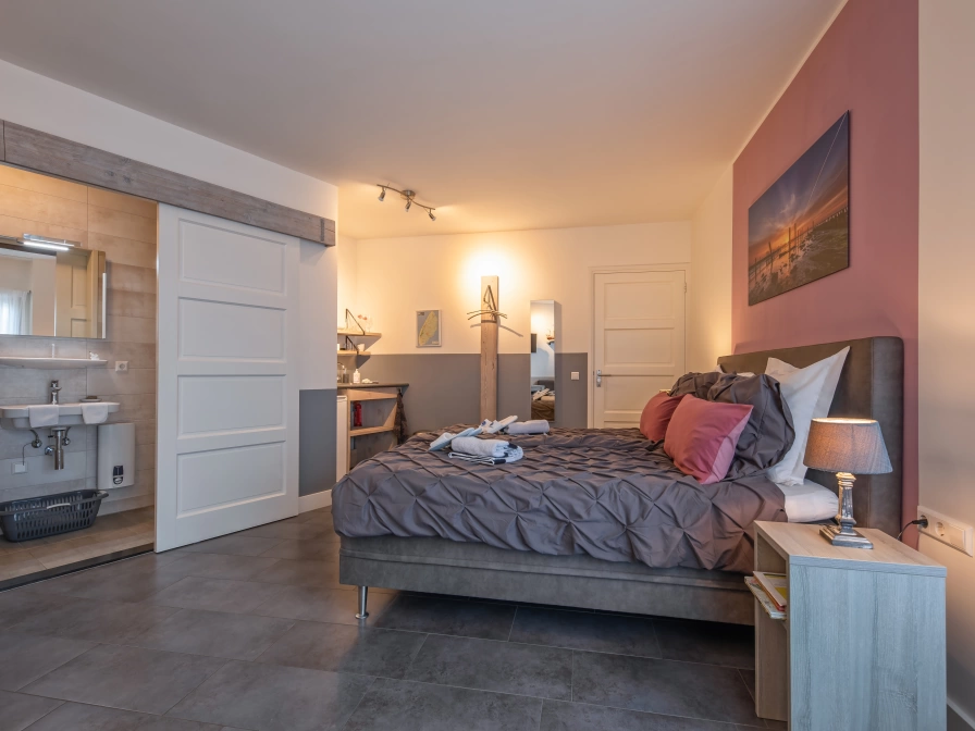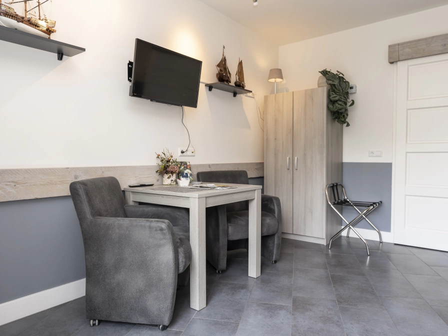 De ruime en comfortabele kamer bevindt zich op de begane grond en heeft een tweepersoons boxspringbed van 180 cm. breed en een eethoek met smart-tv. De keukenhoek is ingericht met een koelkast met vriezer, een waterkoker en Nespresso. De luxe badkamer heeft een douche, een wastafel en een toilet. Achter de openslaande deur, met hordeur, bevindt zich een terras met zitje en parasol. Het terras is afgesloten.