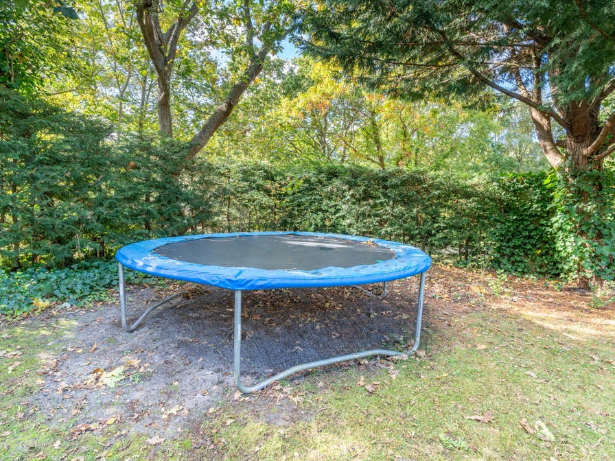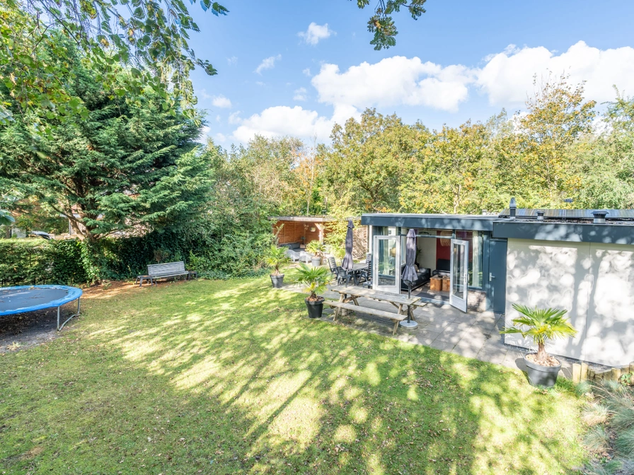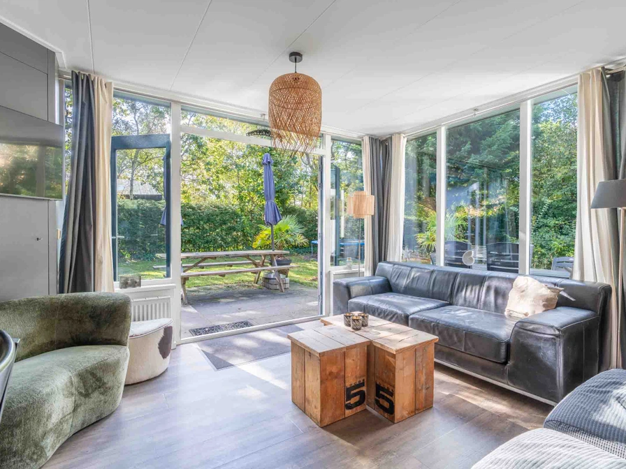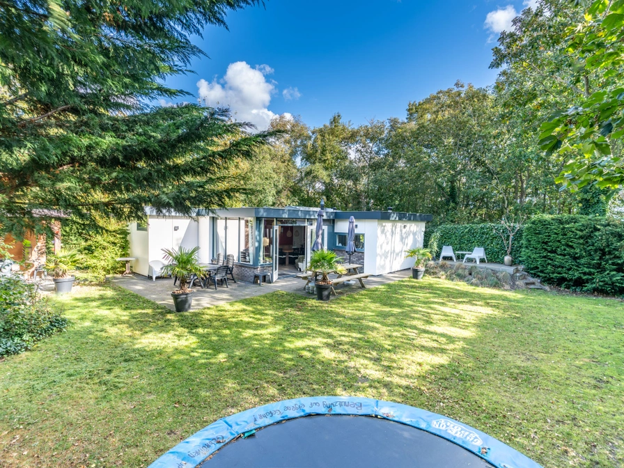 Entree, ruime woonkamer met een zithoek met tv en een eethoek met eettafel voor 6 personen. Door de grote raampartijen staat de woonkamer in directe verbinding met de ruime tuin. De nette open keuken is van alle gemakken voorzien zoals een koelvries combinatie, oven, magnetron, vaatwasser en verschillende koffiezetapparaten. Er zijn 4 slaapkamers aanwezig, waarvan 2 slaapkamers voorzien zijn van 2 eenpersoons bedden en een wastafel en 2 slaapkamers voorzien zijn van een tweepersoons boxspring bed en een wastafel. Er zijn 2 nette badkamers aanwezig, één is voorzien van een ligbad met de mogelijkheid om in het bad te douchen, een toilet en een wastafel. De andere badkamer heeft van een inloopdouche met rainshower, toilet en een wastafel. Via openslaande deuren staat de woonkamer in de directe verbinding met de ruime tuin welke op het zuiden gelegen is en volledig wordt omringd door bomen. Er zijn verschillende zithoeken zoals een loungehoek met loungebank waar je heerlijk van het buitenleven kunt genieten. Voor volop speel plezier is er een trampoline en een badminton ruimte aanwezig. De tuin is volledig omheind en tuinmeubilair en parasol zijn aanwezig.
