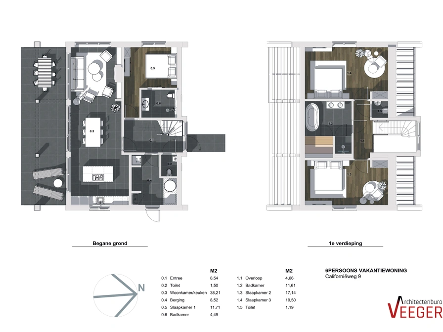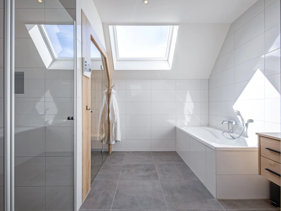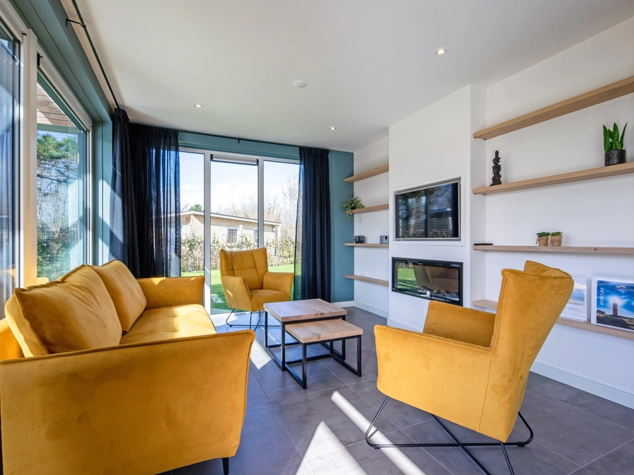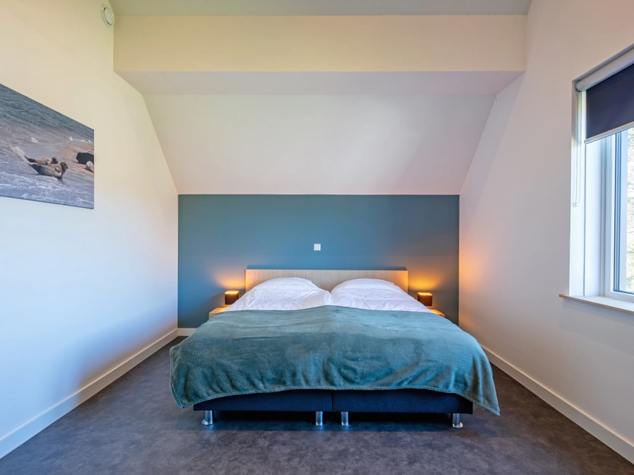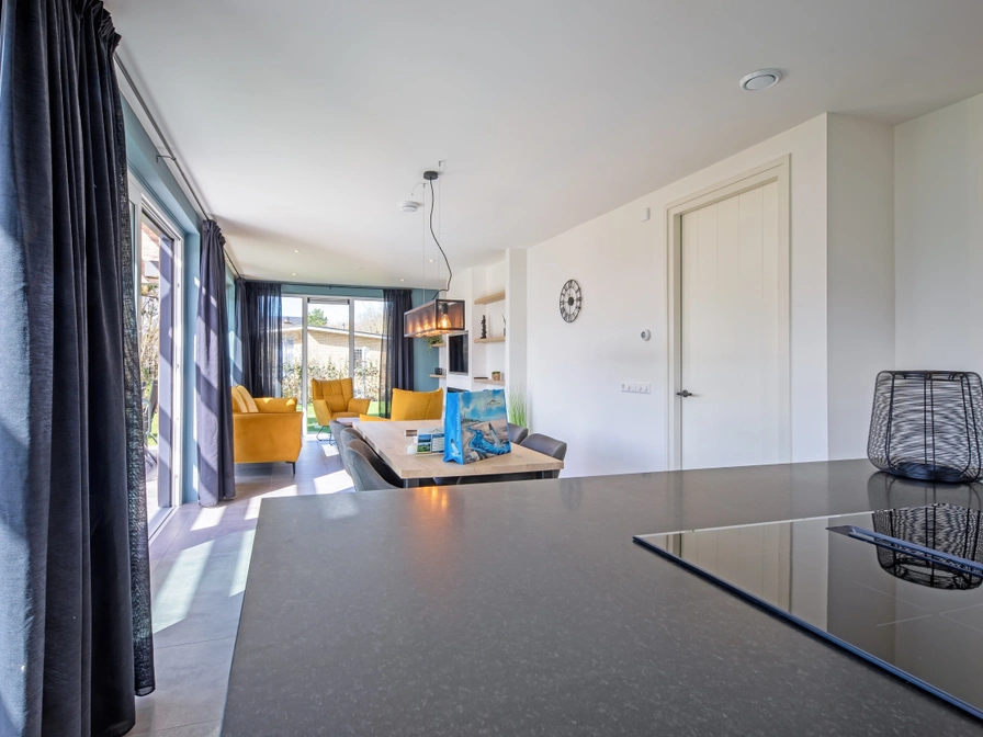 Entree via de hal. Lichte woonkamer met ramen over de gehele lengte van het huis. De woonkamer is ingericht met een zithoek, sfeerhaard, smart-tv en bluetooth speaker. De open keuken met kookeiland is uitgerust met vaatwasser, inductiekookplaat, combi-magnetron, filterkoffiezetapparaat en Nespresso. Slaapkamer met 2 eenpersoonsbedden (90x200 cm), tv en eigen badkamer met douche en toilet. Separaat toilet. Bijkeuken met wasmachine en wasdroger. Op de bovenverdieping bevinden zich 2 slaapkamers met elk 2 eenpersoonsbedden (90x200 cm) en tv. Badkamer met ligbad, douche en sauna. Separaat toilet. Vanuit de woonkamer kom je via een schuifpui naar het terras met tuinmeubilair, veranda en barbecue. De compleet omheinde tuin is 400 m2 groot.