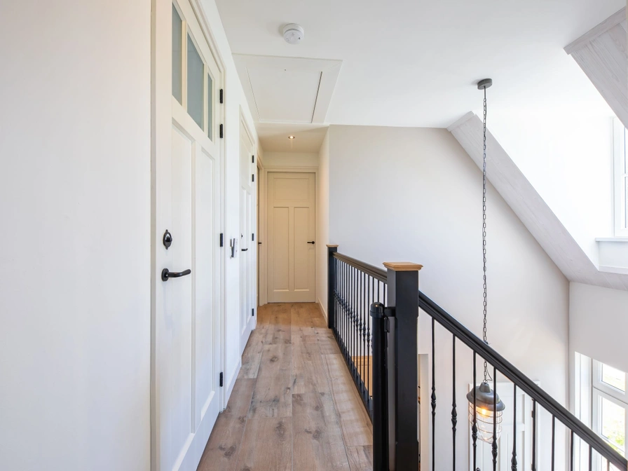 Via de grote hal met vide kom je door de dubbele deuren in de ruime L-vormige living. Aan de ene kant is een grote open keuken voorzien van alle denkbare apparatuur, een kookeiland met gezellige krukken. De andere kant beschikt over een zeer grote en comfortabele bank, fraaie houtkachel, gezellige zithoek en eethoek. Op de begane grond is één grote slaapkamer, deze beschikt over een zeer ruime badkamer met douche en wastafelmeubel. Deze slaapkamer is ook voorzien van een TV. In de hal is een toilet aanwezig. De berging is voorzien van wasmachine en droger. Via de trap in de vide kom je op de overloop op de eerste verdieping. Hier is een apart toilet, grote badkamer voorzien van ruim ligbad, inloopdouche en wastafelmeubel. Er zijn drie zeer ruime slaapkamers, waarvan één voorzien van eigen badkamer met toilet, douche en wastafelmeubel. Deze kamer heeft ook een TV, een derde bed en een lekker zitje. Alle kamers hebben veel lichtinval, Swiss Sense boxspringbedden met één matras van 180 x 210 cm en twee aparte dekbedden. De kasten bieden voldoende opbergruimte en bij de bedden zijn leeslampjes aanwezig. Door de diverse tuindeuren zijn de verschillende terrassen te bereiken en voorzien van meubilair. Rondom is er een fabelachtig uitzicht over het Texelse landschap.