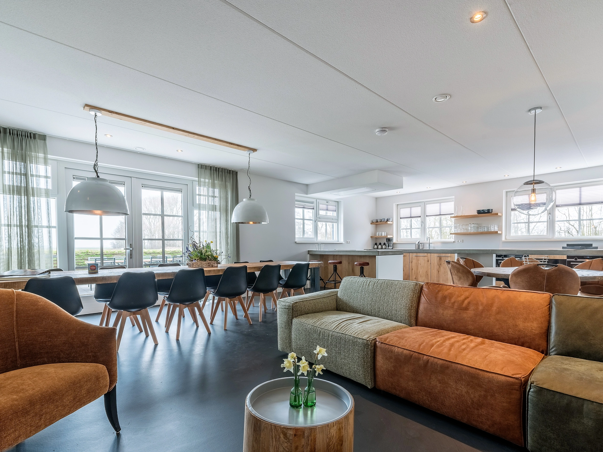 Via de entree kom je in de grote woon/eetkamer met open haard, speeltafel, royale zithoek, tv en ruime eethoek. Er is een woonkeuken met een vaatwasser, magnetron, 2 heteluchtovens, een dubbele inductieplaat, een grote koelkast, een Quooker, een koffiezetapparaat en een uitgebreide keukeninventaris. Op de begane grond is een ruime hal, toilet en een royale slaapkamer. Op de 1e verdieping zijn 3 slaapkamers met elk 2 eenpersoons bedden en elk een eigen badkamer met wellnessdouche, wastafel en toilet. Op de 2e verdieping zijn de vijfde en zesde slaapkamer. Iedere hotelkamer heeft een tv, een ruime kastenwand en een eigen badkamer met wellnessdouche, wastafel en toilet. Alle kamers zijn voorzien van twee eenpersoons boxspring bedden. De bedden kunnen vastgehaakt worden om als twee persoons bed te dienen. Via openslaande deuren kom je vanuit de gemeenschappelijke woonkamer op een terras met terrasmeubilair. Het huis ligt op een prachtig landgoed, omringd door bomen en grenzend aan weilanden.