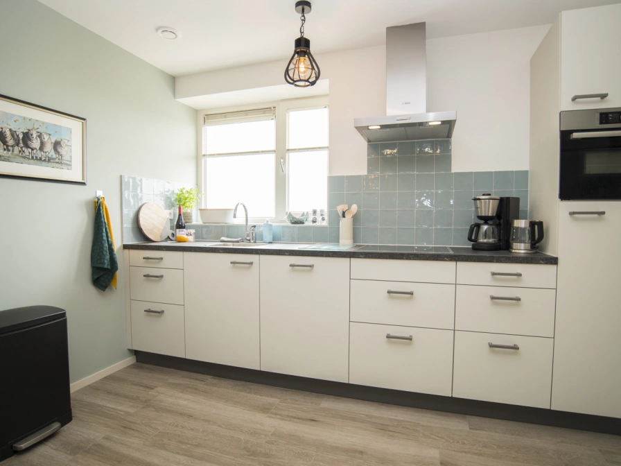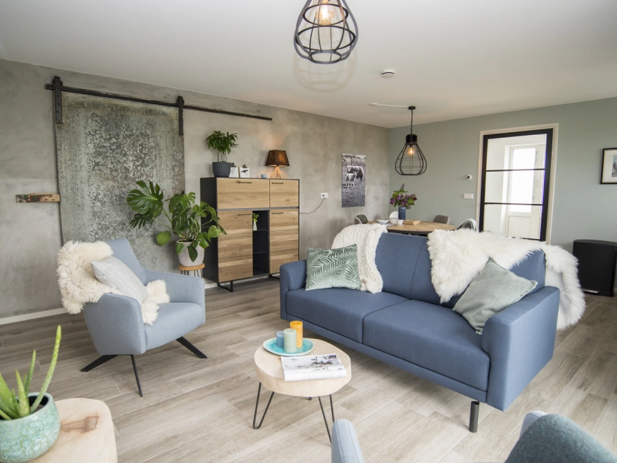 Ruime woonkamer met comfortabele zithoek met tv. Open keuken met o.a. combimagnetron, koffiezetapparaat en vaatwasser. Er zijn twee slaapkamers met elk twee eenpersoons-boxspring-bedden. Badkamer met douche, toilet en dubbele wastafel. Er is een apart toilet. Via openslaande deuren kom je vanuit de woonkamer op een ruim terras op het zuiden.
