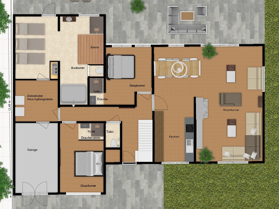 Entree, hal, royale living met een zithoek met gashaard, smart TV en Harman Kardon speakers. Er is een eethoek met een grote eettafel voor 10 personen. De open keuken is compleet ingericht met diverse inbouwapparatuur, zoals koelkast met vriesvak, combimagnetron en vaatwasser. Daarnaast is de keuken o.a. uitgerust met een Jura koffiemachine, filter koffiezetapparaat, melkopschuimer en broodrooster. Er zijn twee slaapkamers op de begane grond die beide zijn voorzien van een badkamer-en-suite met een inloopdouche en wastafel. Op de begane grond bevindt zich een wellness ruimte met een koffie corner, ligbedden, Finse sauna, inloop douche, ligbad, wastafel en toilet. Daarnaast is er op de begane grond nog een extra apart toilet. Op de eerste etage bevinden zich drie slaapkamers en een aparte vierde badkamer. Deze badkamer is voorzien van een ruime inloopdouche, een badmeubel en toilet. Op de eerste etage is ook een extra ruimte waar je een babybed kunt neerzetten. Alle slaapkamers in het huis beschikken over comfortabele boxspring bedden waarvan 3 met tweepersoons topdek matras. Vanuit de woonkamer kom je via schuifdeuren op je ruime terras met een buitenkeuken met The Bastard BBQ, een dining en lounge set met vuurschaal en een parasol. De tuin is volledig afgesloten en gelegen op het zuiden met een weids uitzicht. In de garage kunt je je fietsen veilig plaatsen. Eigen parkeerplaatsen.