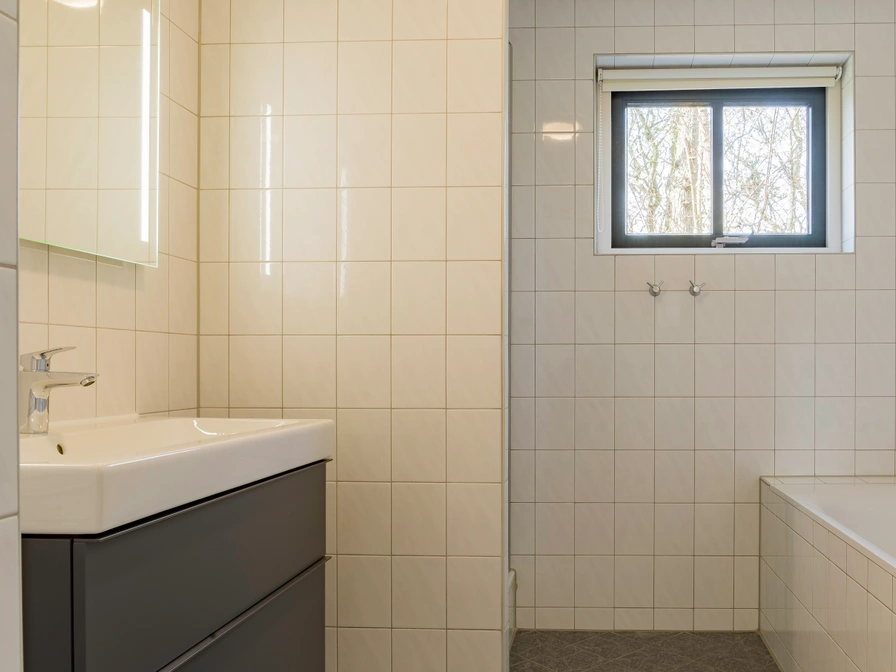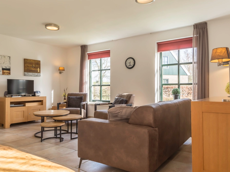 Entree, woonkamer met zithoek, eethoek en tv. Open keuken met vaatwasser, koelkast met vriesvak, combi-magnetron/oven/grill, filterkoffieapparaat, Senseo en waterkoker. Slaapkamer met 2 eenpersoons bedden. Badkamer met douche, ligbad, wastafel en toilet. Op de eerste verdieping zijn nog twee slaapkamer met elk 2 eenpersoons bedden. Tweede badkamer met douche en wastafel. Het vrijstaande vakantiehuis heeft een ruime tuin met terras en tuinmeubels.