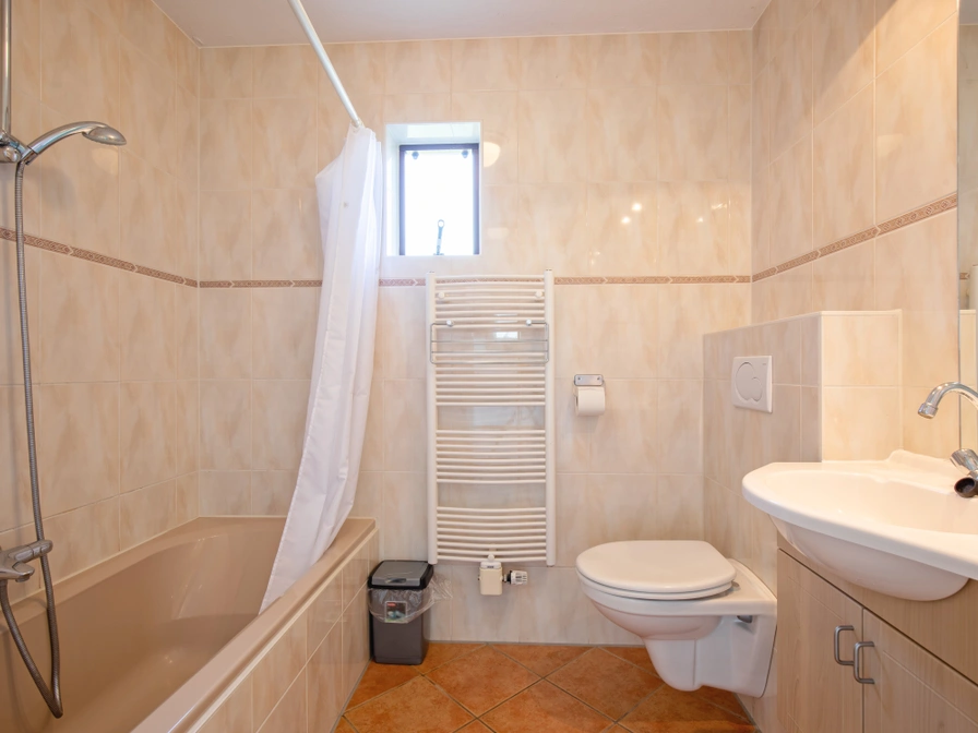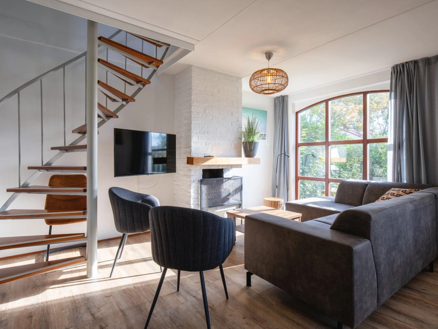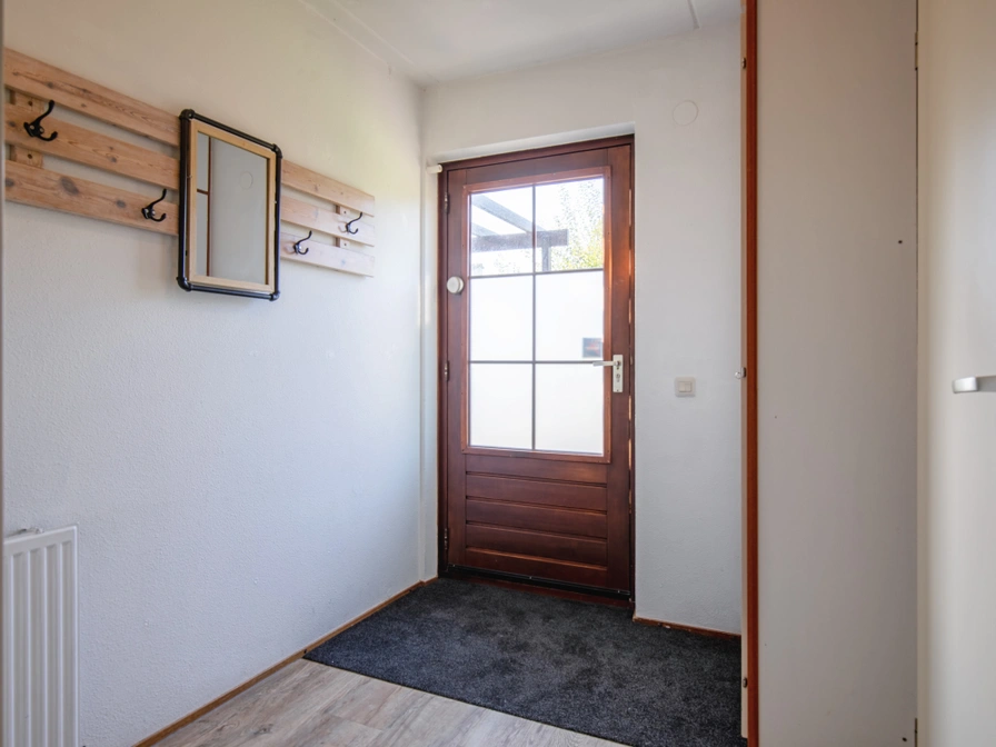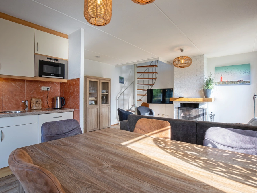 De woonkamer is voorzien van een zit- en eethoek, televisie en een open haard. De open keuken is o.a. voorzien van een vaatwasser en combimagnetron. Er zijn 3 slaapkamers waarvan 1 op de begane grond, allen met twee eenpersoonsbedden. Er is één badkamer met ligbad, wastafel en toilet op de begane grond. Op de eerste verdieping een badkamer met douche, wastafel en toilet. Deze geschakelde bungalow heeft een grote tuin met terras.