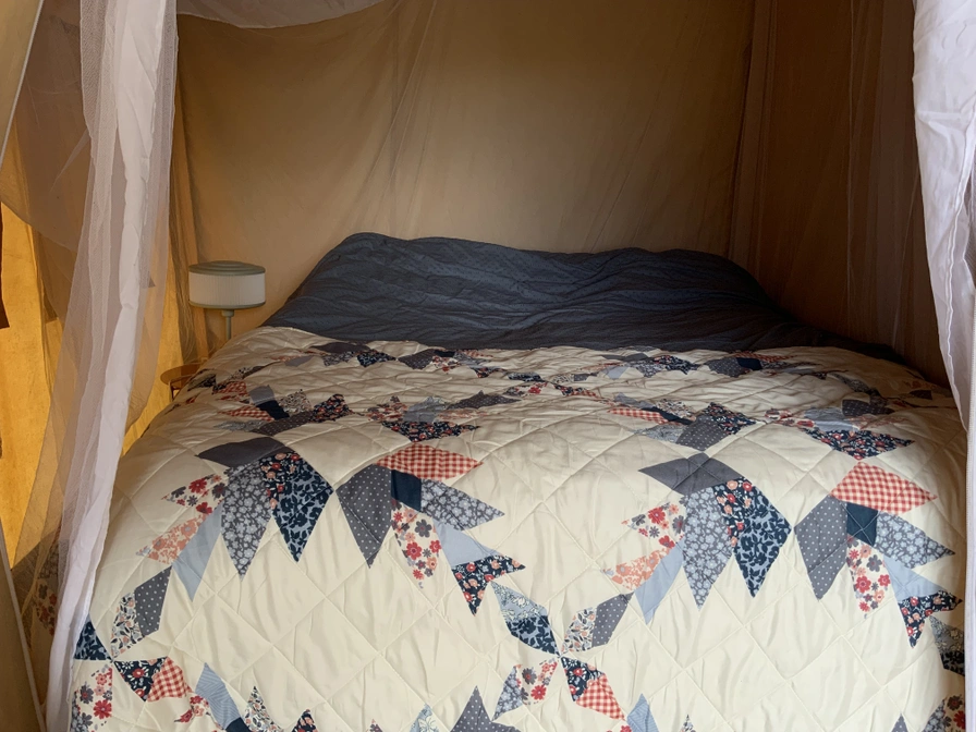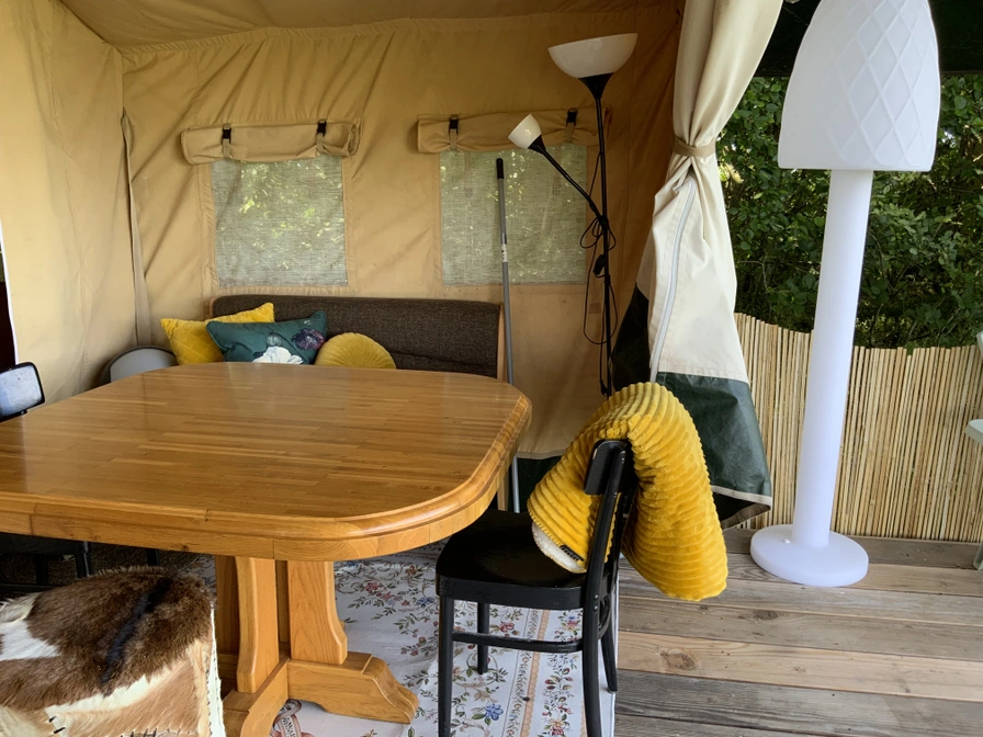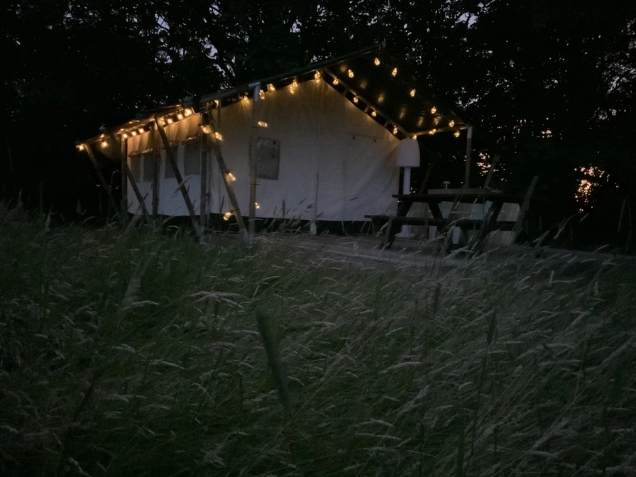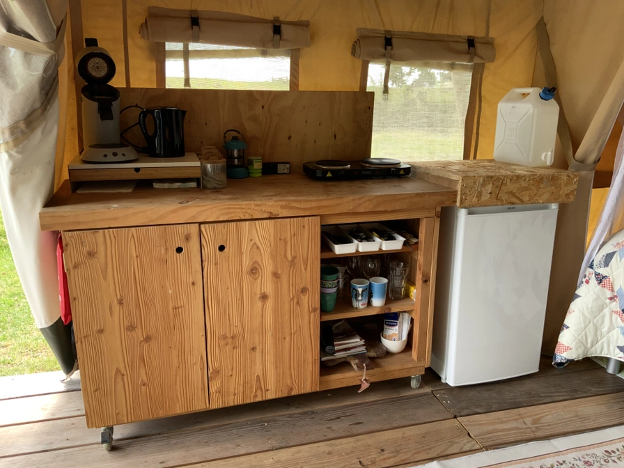 De safaritent beschikt over een ruim terras met picknicktafel en een gezellig ingericht voorste gedeelte met eettafel, bankje en stoelen. Het keukenblokje is volledig uitgerust met een tweepits elektrische kookplaat, koelkast met vriesvak, waterkoker, Nespresso-koffieapparaat, vaatwassertje en complete keukeninventaris. Dit seizoen staat er naast de safaritent een comfortabele caravan die dienstdoet als hoofd- en slaap accommodatie. Met een lengte van ruim 6 meter biedt de caravan alle ruimte voor een ontspannen verblijf. In de safaritent kun je koken en gezellig samen zitten. Daarnaast is de tent voorzien van een kledingrek, diverse legplanken en meerdere elektrapunten. Op slechts 20 meter afstand beschikt u over uw eigen douche en toilet. Dankzij de unieke ligging sta je alleen op het terrein en kun je ongestoord genieten van rust, natuur en privacy.