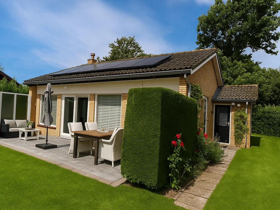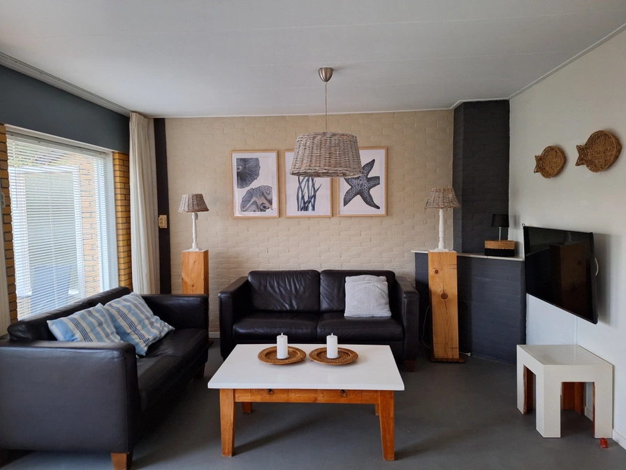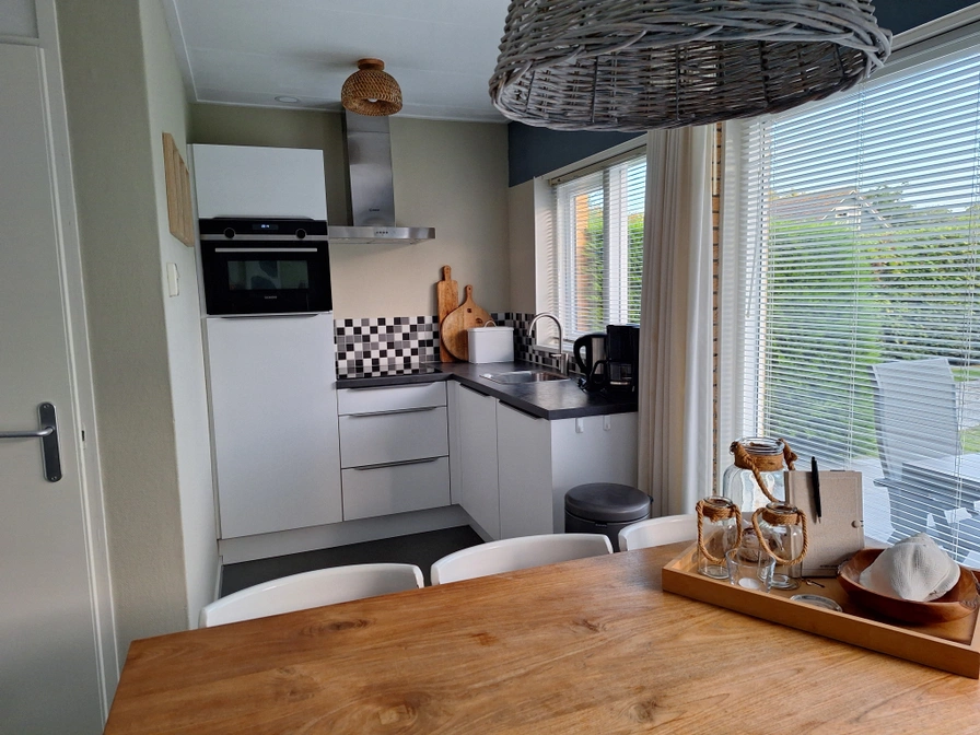 De woonkamer van dit vrijstaande vakantiehuis heeft een zithoek met tv en een eethoek. De open keuken is ingericht met koelkast, vriezer, combimagnetron en vaatwasser. Er zijn drie slaapkamers 1 met tweepersoonsbed (eenpersoonsmatrassen) 1 met twee eenpersoonsbedden en 1 met een stapelbed. Er is een doucheruimte met daarnaast een separaat toilet. Dit huis heeft een tuin met terras. Tuinmeubilair is aanwezig.