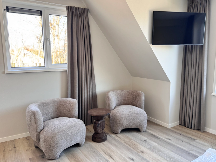 De woonkamer van deze vrijstaande villa heeft een eethoek en zithoek met kabel-TV en audioset. Er is een ruime hal met toilet. De keuken is voorzien van inductiekookplaat, koelkast met vriezer, afwasmachine, magnetron, oven, koffiezetapparaat, Nespresso, waterkoker en broodrooster. In de berging staan een wasmachine en een wasdroger. Op de begane grond is 1 slaapkamer met twee 1-persoons boxspringbedden en een eigen badkamer met douche en wastafel. Op de bovenverdieping zijn 3 slaapkamers met ieder twee 1-persoons boxspringbedden. Er is een badkamer met ligbad, douche, wastafel en apart toilet. De villa’s zijn energiezuinig en worden verwarmd met een warmtepomp. Deze luxe villa heeft een ruime tuin met terras op het zuiden. Tuinmeubilair is aanwezig. Op de bedden liggen synthetische dekbedden.