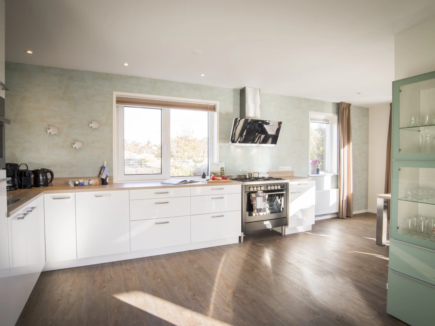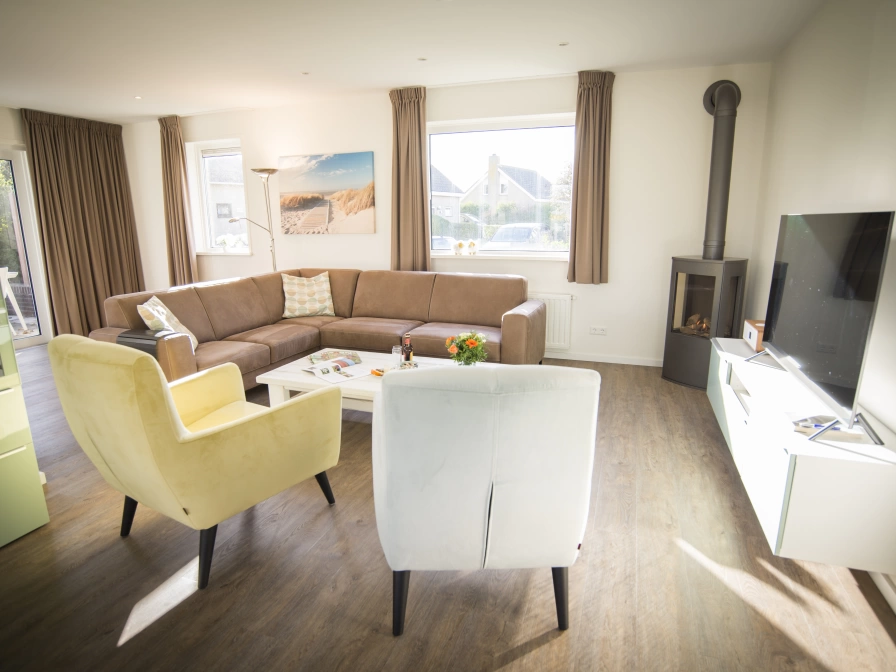 Dit vrijstaande vakantiehuis heeft een ruime hal. De living is voorzien van zithoek met gashaard, flatscreen UHD-tv, DAB-radio inclusief cd-speler en schuifdeuren naar het terras. De leefkeuken is ingericht met een 6-pits gasfornuis inclusief oven, magnetron, koelkast met vriesvak, vaatwasser, waterkoker, koffiezetapparaat, Nespresso en een grote eethoek. Daarnaast is er een bijkeuken met wasmachine en droger. Er is een slaapkamer met 2 eenpersoons bedden (80x200), met een 2-persoons matras) en een tv. De badkamer heeft een inloopdouche, wastafelcombinatie en toilet. Op de eerste verdieping zijn twee slaapkamers met elk 2 eenpersoonsbedden (90x200), een tv en een wastafelcombinatie. In een van de slaapkamers is een kinderledikant beschikbaar. De tweede badkamer heeft een inloopdouche en toilet. Rondom dit vakantiehuis bevindt zich een tuin. Er is een ruim terras op het zuidwesten. Tuinmeubilair is aanwezig.
