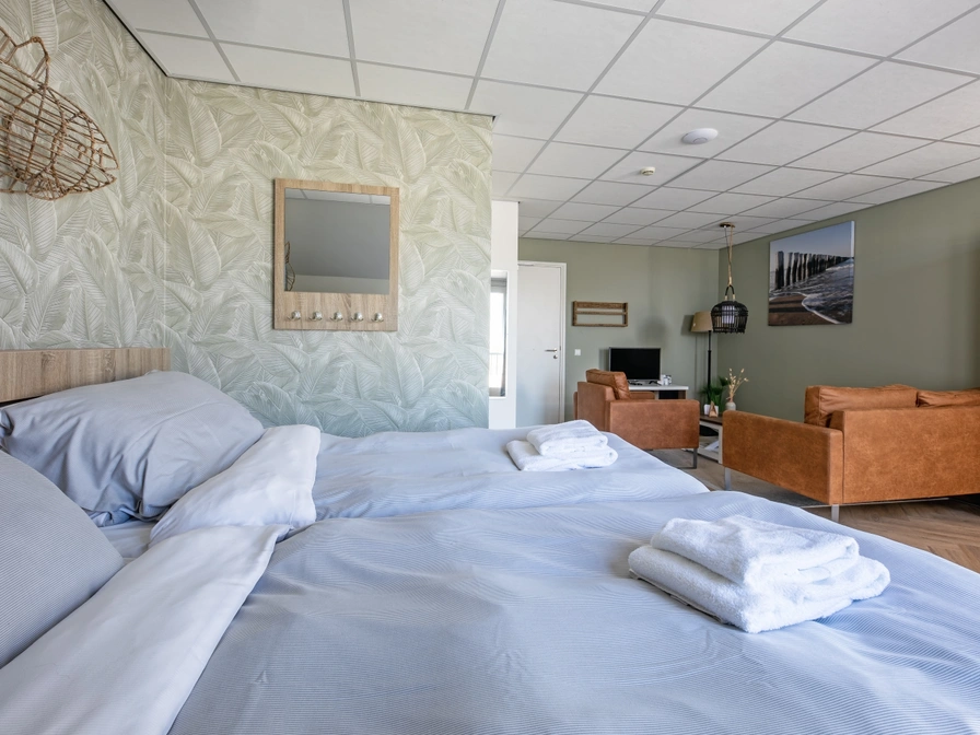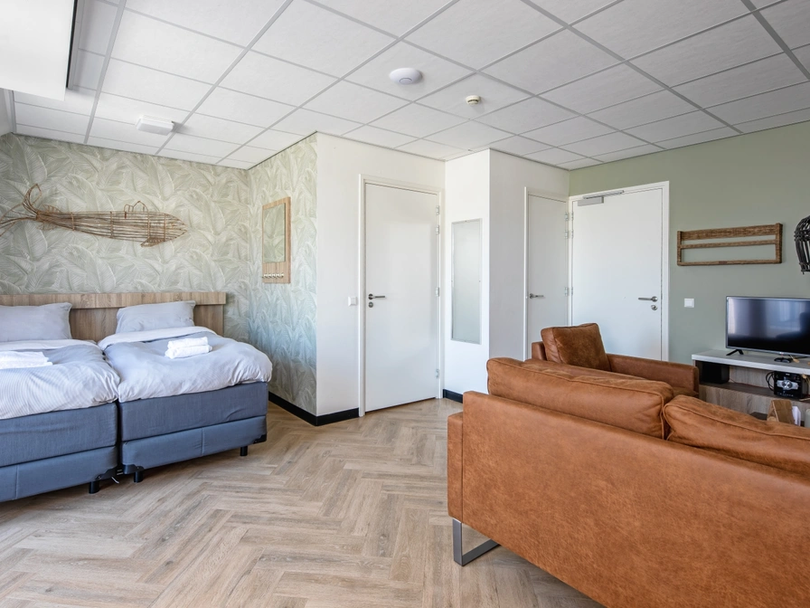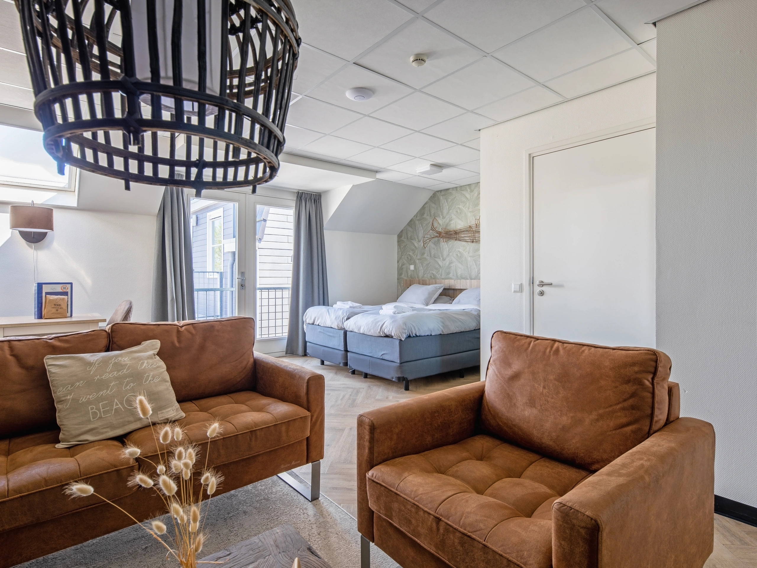 Suite type Strandsuite heeft een zithoek met flatscreen tv en een eethoek. In de suite staan 2 eenpersoons boxspringbedden. De open pantry is ingericht met een koelkast met vriesvak, vaatwasser, waterkoker en Nespresso apparaat. De badkamer heeft een douche, wastafel en toilet. Deze suite heeft een Frans balkon.