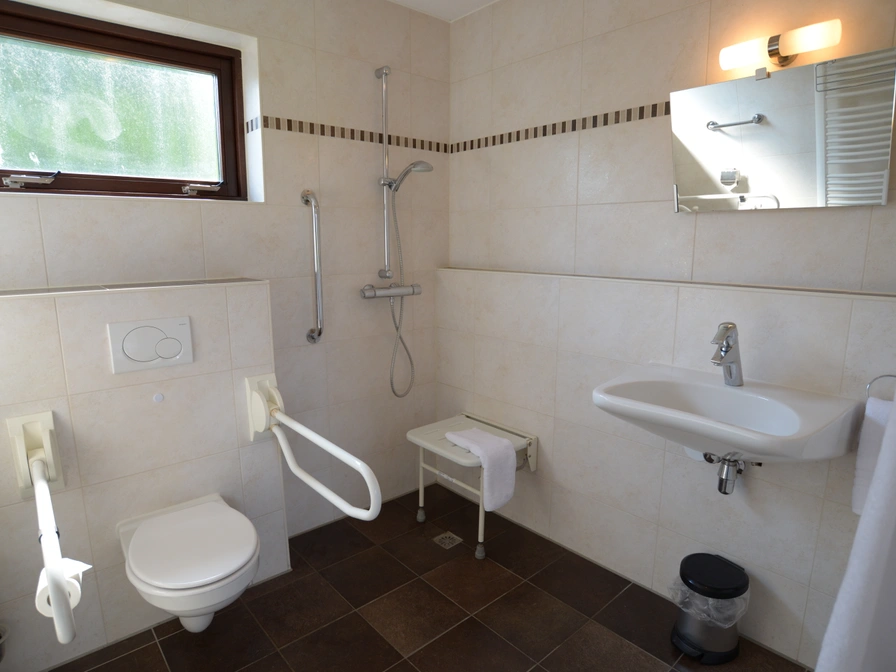 De woonkamer van dit vrijstaande vakantiehuis heeft een zithoek met smart-tv. Er is ook een eethoek met extra hoge tafel (voor een rolstoel). De open keuken is ingericht met combimagnetron en vaatwasser. Er is een slaapkamer met 2 eenpersoons elektrische hoog/laag(90 x 200) bedden. De badkamer heeft een ruime douche met douchestoel, wastafel met verstelbare spiegel en toilet met beugels. Op de bovenverdieping zijn twee slaapkamers met elk 2 eenpersoons boxspringbedden (90 x 200). Een van de slaapkamers heeft een zithoek met flatscreen-tv. Er is een tweede badkamer met bad/douche en toilet. Dit vakantiehuis heeft een terras met tuinmeubilair.