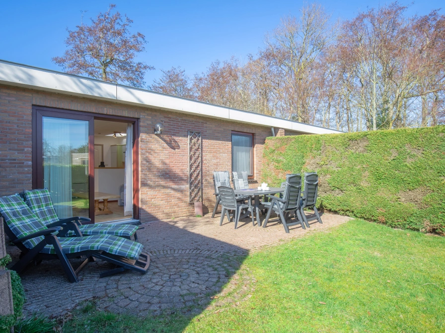 De woonkamer van deze geschakelde bungalow heeft een eethoek en zithoek met flatscreen-tv, dvd-speler en radio/cd-speler. De open keuken is ingericht met een koelkast, drieladen diepvriezer, combimagnetron, vaatwasser, waterkoker en koffiezetapparaat. Er zijn twee slaapkamers met elk 2 eenpersoons boxspringbedden en een wastafel. De badkamer heeft een ligbad, aparte douche en wastafel. Er is een apart toilet. Deze bungalow heeft een royale tuin met terras op het zuiden. Tuinmeubilair is aanwezig.