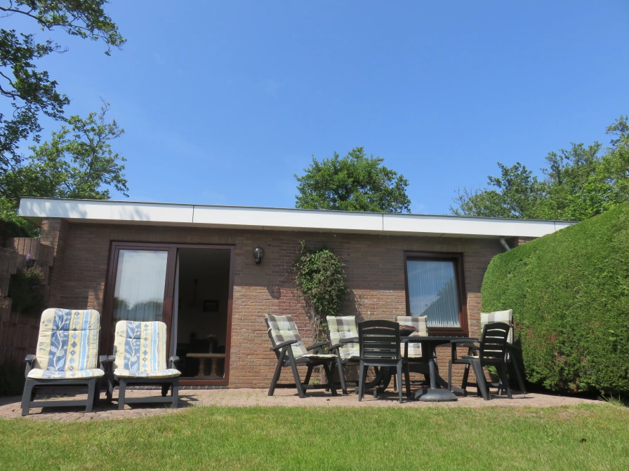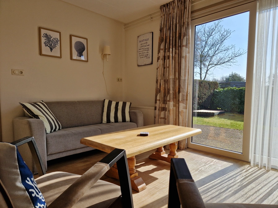 De woonkamer van deze geschakelde bungalow heeft een eethoek en zithoek met flatscreen-tv, dvd-speler en radio/cd-speler. De open keuken is ingericht met een koelkast, drieladen diepvriezer, combimagnetron, vaatwasser, waterkoker en koffiezetapparaat. Er zijn twee slaapkamers met elk 2 eenpersoons boxspringbedden en een wastafel. De badkamer heeft een ligbad, aparte douche en wastafel. Er is een apart toilet. Deze bungalow heeft een royale tuin met terras op het zuiden. Tuinmeubilair is aanwezig.