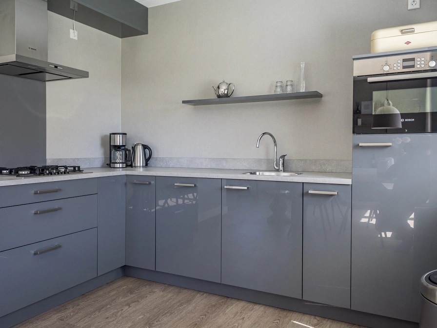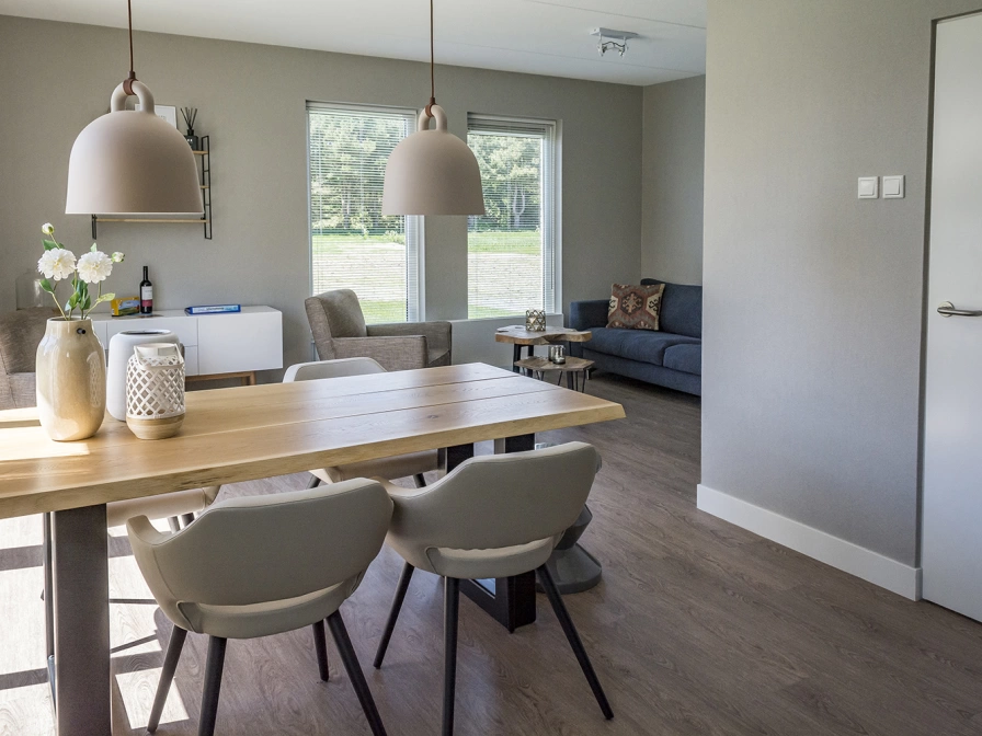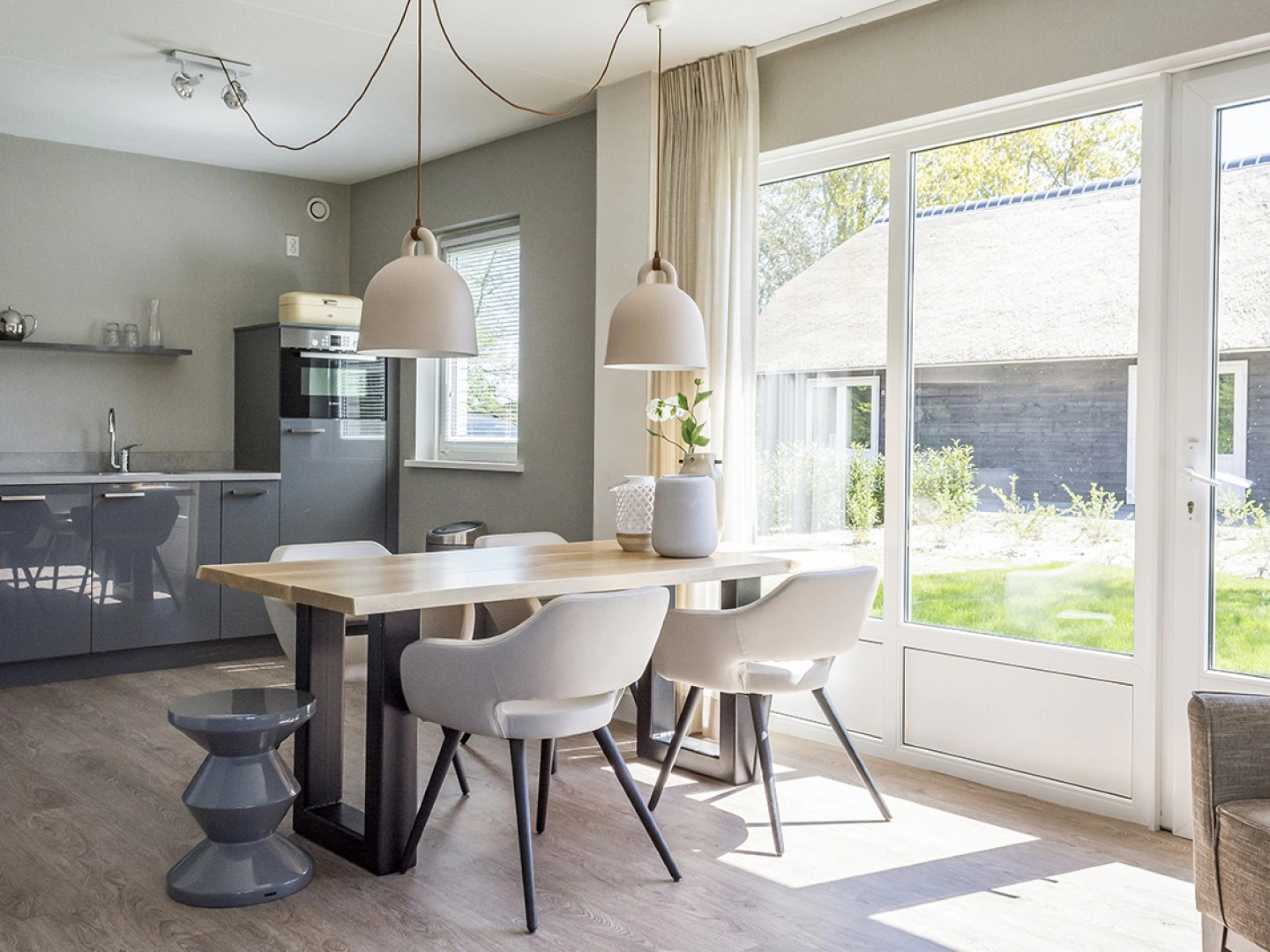 De woonkamer van dit vrijstaande vakantiehuis heeft een zithoek met tv en een eethoek. De open keuken is ingericht met vaatwasser, combimagnetron, koelkast met vriesvak, koffiezetapparaat en waterkoker. Er is een toilet aanwezig. Op de bovenverdieping zijn twee slaapkamers met elk 2 eenpersoons boxspringbedden. De badkamer heeft een douche, wastafel en toilet. Dit vakantiehuis heeft een terras met tuinmeubilair.