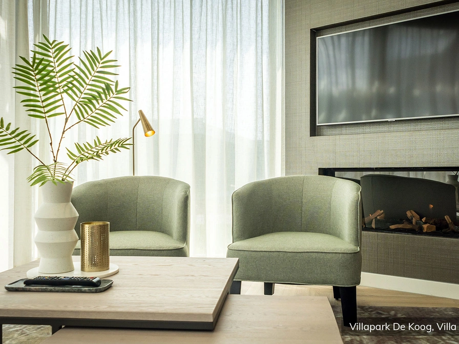 De villa heeft vloerverwarming en een designhaard. Alle slaapkamers hebben een eigen badkamer. De vier- en zespersoons villa’s zijn eventueel te koppelen tot acht- of twaalf persoons villa. Bedden zijn bij aankomst opgemaakt.