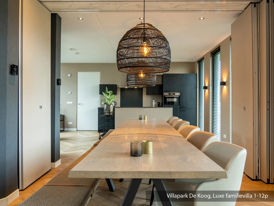 Deze 12-persoons villa bestaat uit twee geschakelde 6 persoons villa’s. Via de hal kom je in de enorme woonkamer met dubbele zithoek, 2 eethoeken en 2 grote smart-tv’s. Twee open keukens met elk een 4-pits kookplaat, afwasmachine en koffiezetapparaat. Twee slaapkamers met elk 2 eenpersoons bedden en een eigen badkamer met douche, wastafel en wc. Apart derde en vierde toilet. Op de eerste verdieping zijn vier slaapkamers met elk twee eenpersoons bedden, twee badkamers met douche, wastafel en wc. Daarnaast zijn er nog twee badkamers met elk een ligbad, wastafel, wc en twee privésauna’s. Er is een ruimte met wasmachine en droger. Vanuit de woonkamer via de grote glazen schuifpuien heb je toegang tot een heerlijk dubbel terras met tuinmeubels en acht ligstoelen.