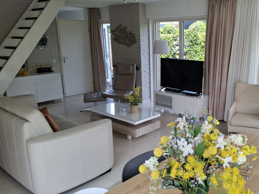 Entree. De woonkamer beschikt over een comfortabele zithoek met tv en een gezellige eethoek. De halfopen keuken is volledig uitgerust met een vaatwasser, magnetron en koelkast. Op de begane grond bevindt zich een slaapkamer met twee eenpersoonsbedden en een badkamer met douche, wastafel en toilet. Op de bovenverdieping is een tweede slaapkamer, eveneens met twee eenpersoonsbedden. Dit vrijstaande vakantiehuis heeft een ruime tuin met een patio en terras, voorzien van tuinmeubilair zodat je heerlijk buiten kunt genieten.