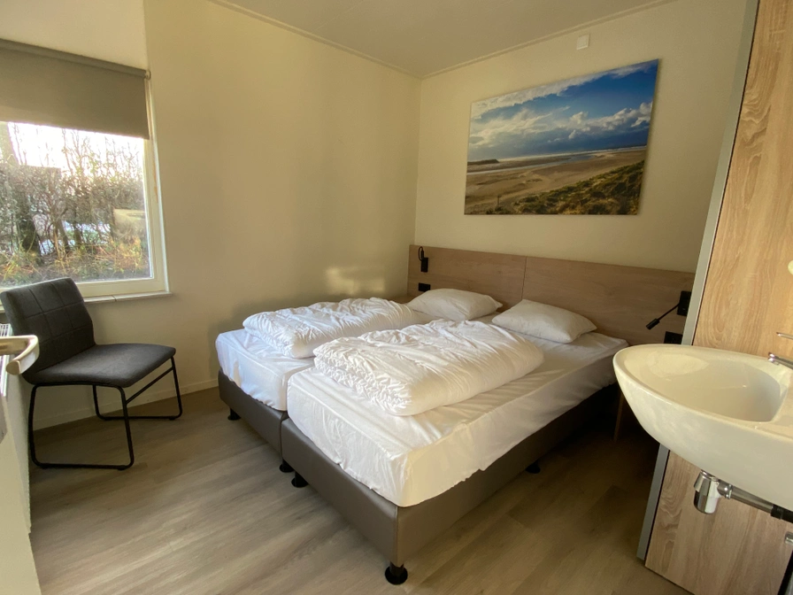 Entree, woonkamer met zithoek en eethoek. Open keuken met o.a. een vaatwasser. Slaapkamer met één tweepersoons bed (160 x 200 cm). Tweede en derde slaapkamer met elk één stapelbed (90 x 200 cm). Badkamer met douche, wastafel en toilet. Rond de bungalow beschik je over een ruim gazon met terras en tuinmeubels. Er is geen TV in de accommodatie aanwezig.