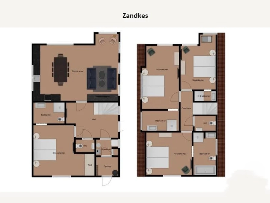 De woonkamer van villa De Zandkes heeft een zithoek met curved smart LED-tv en radio/cd-speler (usb en bluetooth). De open keuken is ingericht met vaatwasser, magnetron, oven, koelkast, vriezer, koffiezetapparaat, Nespresso Umilk, waterkoker, broodrooster, citruspers en een eethoek. Op de begane grond is er een slaapkamer met 2 eenpersoons boxspringbedden en smart LED-tv. Aangrenzend ligt een badkamer met douche en toilet. Er is een apart toilet aanwezig. Op de bovenverdieping zijn drie slaapkamers, waarvan een met 2 eenpersoons boxspringbedden, smart LED-tv en een eigen badkamer voorzien van whirlpool, douche en toilet. De andere twee slaapkamers hebben ieder 2 eenpersoons boxspringbedden, smart LED-tv en een eigen badkamer voorzien van douche. Het toilet is apart. Villa De Zandkes heeft een tuin, met een royaal terras op het zuiden. Tuinmeubilair is aanwezig.