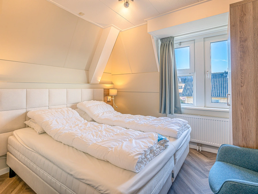Dit comfortabele 4-persoons appartement ligt op de tweede etage. De gezellige woonkamer beschikt over een zithoek en TV. Er is een eethoek met eettafel voor 4 personen. De open keuken is compleet ingericht met diverse inbouwapparatuur. Er zijn twee slaapkamers met elk twee comfortabele 1-persoons boxspringbedden en TV. De badkamer is voorzien van een inloop douche en wastafel. Apart toilet. Het balkon is vanuit de woonkamer via een schuifdeur te bereiken en is op het westen gelegen. Tuinmeubilair is aanwezig.