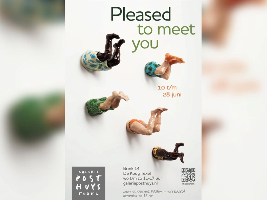 10 juni t/m 28 juni 2026 Bij Galerie Posthuys in De Koog worden van 10 juni tot en met 28 juni 2026 de boekpresentatie en expositie ‘Pleased to Meet You’ van keramist Jeannet Klement gehouden. Tijdens deze periode zie je niet alleen nieuw werk, maar maak je ook kennis met het boek dat in 2026 over haar verschijnt. De recente keramische beelden en tableaus van Jeannet Klement zijn lichtvoetig en observerend. In haar werk onderzoekt zij hoe mensen elkaar bekijken en hoe de relatie tussen mens en omgeving voortdurend verandert. In een samenleving die steeds in beweging is, legt zij met grove klei alledaagse momenten vast: mensen die werken, spelen, eten, luieren of naar elkaar omkijken. Zo ontstaat een bijzondere expositie vol herkenning, observatie en subtiele commentaren op het openbare leven. Tijdstip: woensdag t/m zondag van 11.00 tot 17.00 uur