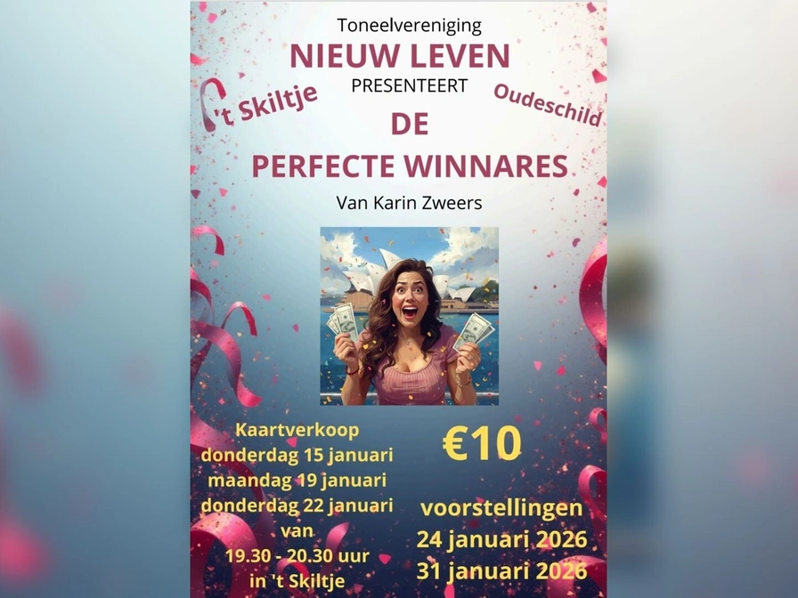 Donderdag 15 en 22 januari en maandag 19 januari 2026 In dorpshuis ‘t Skiltje is een voorstelling van toneelvereniging Nieuw Leven met het stuk ‘De perfecte Winnares’ van Karin Zweers. Kaartverkoop 15, 19 en 22/1 19:30-20:30 uur á €10.-. Startijd: 20:00 uur, Zaal geopend vanaf 19:30. Kosten: € 10,-