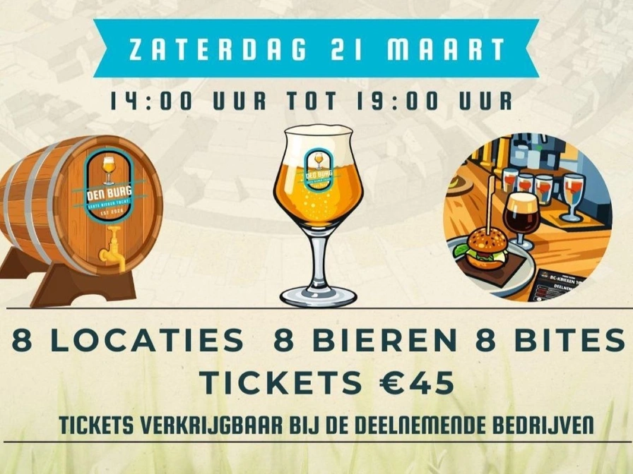 Zaterdag 21 maart 2026 Doe mee met deze Lentebierentocht in Den Burg! Acht locaties, acht bieren, acht bites. De tocht begint om 14.00 uur en duurt tot 19.00 uur. In 8 verschillende zaken krijg je een heerlijk Lentebier met een hapje! Tickets zijn te koop in de deelnemende zaken: Restaurant De Stal Café de Slock Texels Proeflokaal De Zwaan De Kastanjeboom Cinema Texel De Twaalf Balcken Eilandbar Mans Gastropub Mans