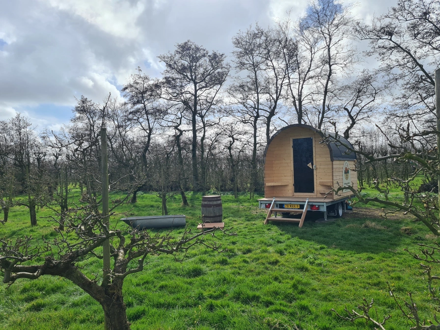 Rij het erf op en parkeer direct aan de linkerkant op de houtsnippers. Volg de bordjes met 'sauna' door de prachtige 'Waelde Tuin' en ontdek de sauna te midden van de perenboomgaard.