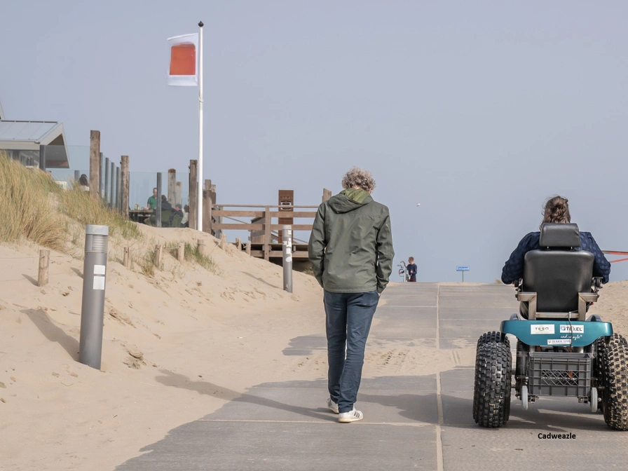Je mag niet met de elektrische rolstoelen door het water rijden! Handleidingen voor de Cadweazle en/of Strandhopper zijn te downloaden via de site van SIGT: sigttexel.nl