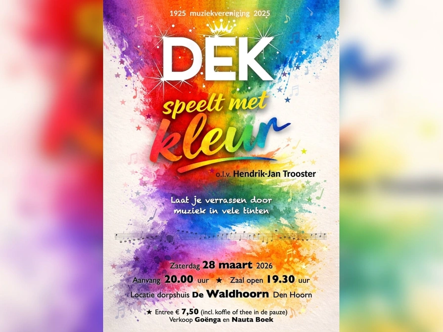 Zaterdag 28 maart 2026 Tijdens het voorjaarsconcert Speelt met kleur brengt DEK Den Hoorn en omgeving een gevarieerd en veelkleurig programma. Weg met zwart-wit en grijs: voor dit concert kozen de muzikanten ieder hun favoriete kleurrijke muziekstukken, die vervolgens zijn geselecteerd en gearrangeerd voor een orkest als DEK. Onder leiding van Hendrik Jan Trooster presenteert DEK een boeket aan muziek dat veelsoortig, veelstemmig en bovenal kleurrijk is. Een concert dat kleur geeft aan het voorjaar. Tijdstip: van 20.00 tot 22.30 uur Kosten: € 7,50 Tickets: verkrijgbaar bij Goënga en Nauta Boek